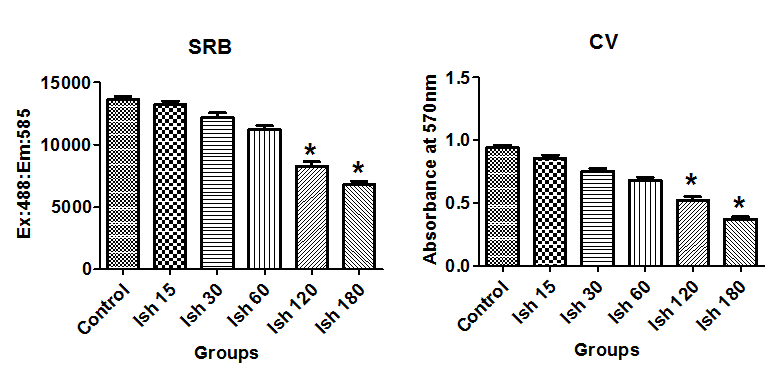 Fig. 2: Standardization of ischemic control by different time interval. Ischemic time duration for whole experiment was fixed based on the results of cell viability assays like sulforhodamine B (SRB) and crystal violet (CV), after incubating LLC PK1 cells with ischemia inducing system namely GOX/CAT (glucose oxidase and catalase 10:1) for different time intervals. Results are expressed as mean±SD of n= 4-6 independent assays (*) P<0.05, statistically different from the control group