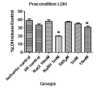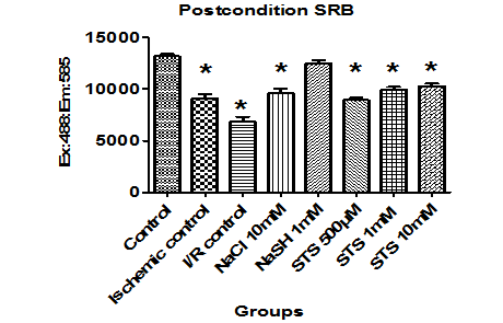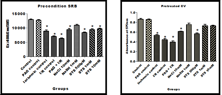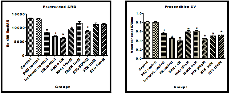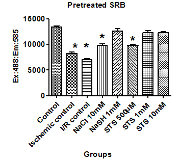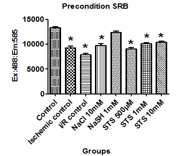 LLC PK1 cells were pre-treated and preconditioned with different concentration of STS (500µM, 1 mM &10 mM) and the results were shown in fig. 3. Cell viability tests like SRB, crystal violet and LDH were used to assess the effect of STS as anti ischemic agent. Pre-treating the cells with 1 mM STS preserve the cells (92% cells are viable as compared to 62% in ischemia) from the ischemic injury However, preconditioning the cell did not show any significant protection from ischemic injury. Furthermore, the results were confirmed by sodium chloride, the negative control and sodium hydrosulfide (H2S donor). As expected, NaSH showed protection against ischemia when it was administered either as a pre treated or precondition agent (fig. 3).