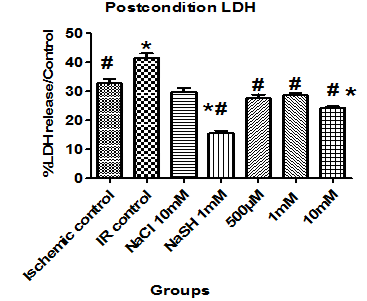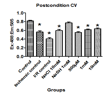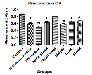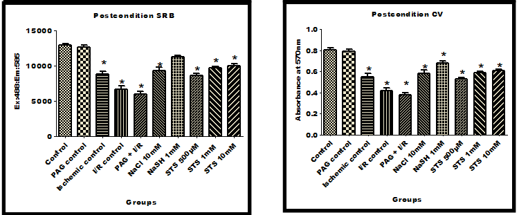 In order to study the role of hydrogen sulphide released by sodium thiosulftae, endogenous sulphide generating enzymes were inhibited by PAG and induce ischemia reperfusion, treated with STS (pre treated, precondition and post condition). Results are expressed as mean ± SD of n= 4-6 independent assays (*) P< 0.05, statistically different from the control group