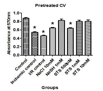 To evaluate the influence of endogenous hydrogen sulfide in STS mediated effect and to verify the release of H2S from STS, cells were pre-incubated with DL propargylglycine (200µM), inhibitor of cystathione gamma lyase) for 1hr before the addition of STS and followed by ischemia and reperfusion.