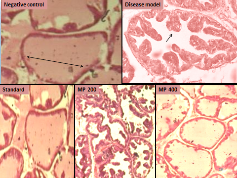 Stroma and gland revealed histology suggestive of normal prostate gland. The group treated with testosterone alone showed mild to moderate disruption of histo-architecture of the gland viz tubules appeared wider with thickened walls, large involutions and narrowed lumen.