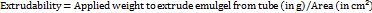 Test to measure the force required to expel the material from the tube. The formulation whose extrudability was to be checked was filled in a clean, lacquered aluminium collapsible metal tube. Extrudability of the emulgel was the weight required to extrude from a lacquered aluminum collapsible tube at least 0.5 cm ribbon of emulgel in 10 s on the application of weight in grams. More the quantity extruded better is the extrudability. The measurement of the extrudability of each formulation was determined in triplicate and the average values are presented. The extrudability is than calculated by using the following formula [11]: