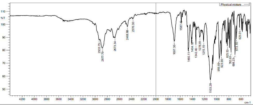 The drug-polymer compatibility study was carried out using FTIR spectrophotometer (Schimadzu). The IR spectra of the drug as well as the physical mixture of the drug and polymer in the ratio of 1:1 were recorded. All the spectras were recorded in the range of 400-4000 cm-1 [8].