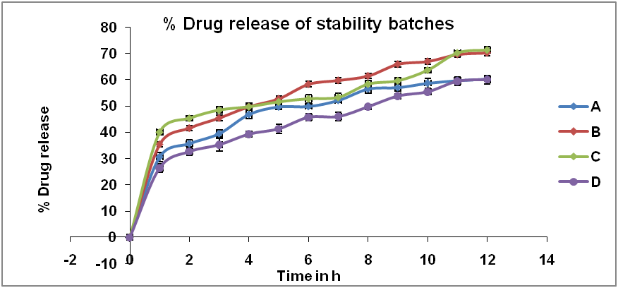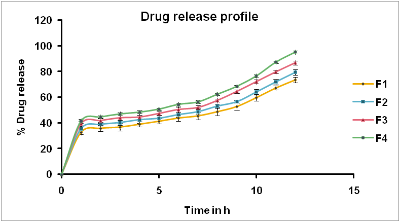 The drug release of all the formulations was studied. The effect of the polymer ratio on the release of the drug from the SLN was studied and compared within four batches. The F4 batch gives better drug release than other batches. The drug release of all formulations (F1-F4) is shown in fig. 1. The solid lipid nanoparticles show an initial burst release (1 h) of 32.76-41.53.05%. The F4 formulation depicted high drug release due to the high concentration of lipid and surfactant ratio. At the end of 12 h, the percentage of drug release was observed around 95.22%: the F4 formulations depicted higher and prolonged drug release over other formulations.