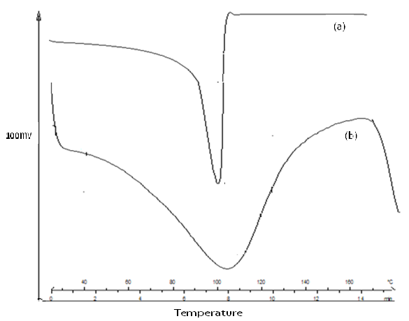 In (fig. 6) 16 graph (b) showed a broad endothermic peak at 103 °C. Another graph (a) is the formulation graph; this graph also showed an endothermic peak at 101 °C. Therefore, that formulation was claimed to be compatible with the polymer. From these results it was clear that the formulation was stable, as there was no significant change in its thermal properties [26]