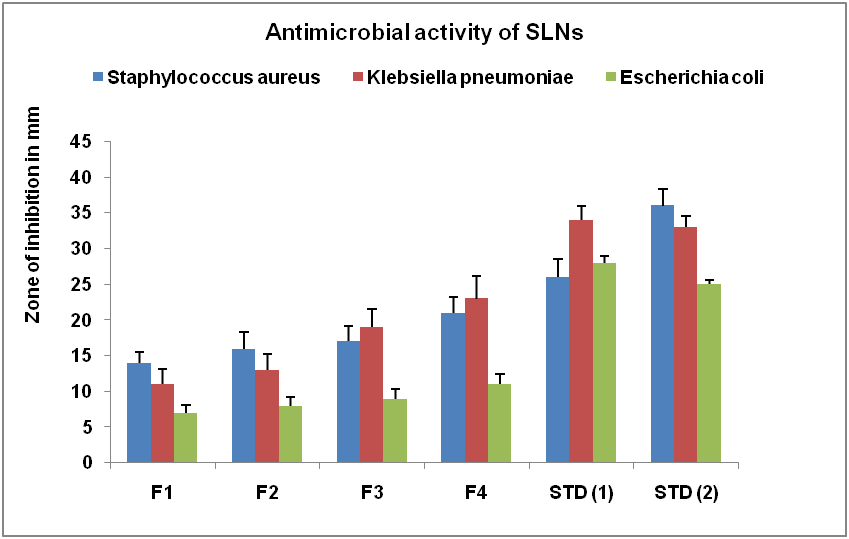 Fig. 7: Diameters of the zone of inhibition of F1 to F4 batches against Staphylococcus aureus, Klebsiella pneumoniae, E. Coli (n=3, mean±SD), STD (1): Ciprofloxacin STD (2): Ampicillin