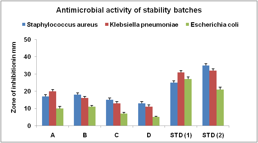Particle size of optimized batch stored at different stability conditions was observed in range of 194 to 235 nm, being higher for the accelerated condition. However, the polydispersity index value was higher in case of photo-stability condition ranging from 0.756 to 0.989. Entrapment efficiency was reduced considerably in accelerated conditions, while antimicrobial activity was retained to a considerable extent at all storage conditions. Drug release studies revealed better drug release in formulation stored at room temperature and refrigerated stability conditions as compared to those at accelerated and photo-stability conditions [26].