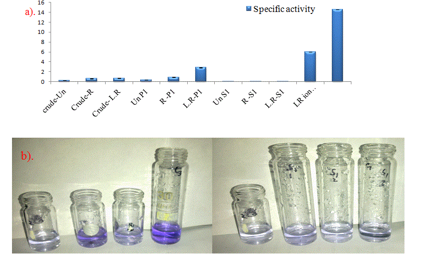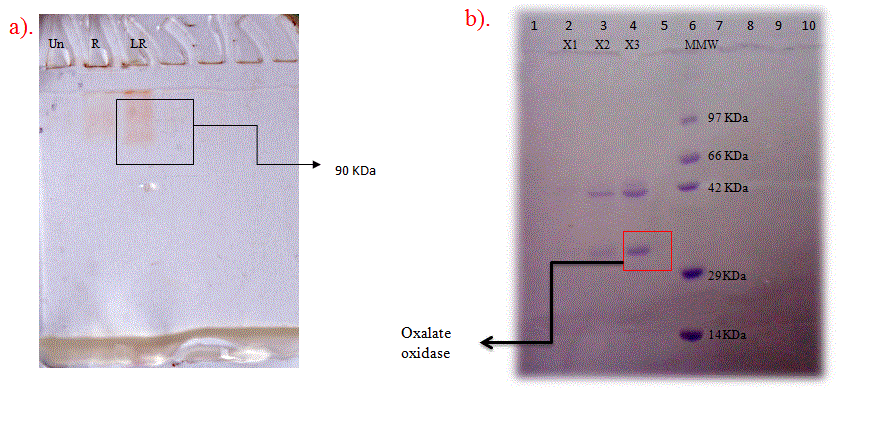 Fig. 6: Native PAGE of oxalate oxidase by active staining on gel using oxalate oxidase gel developer. Zhang. Z., Yang. L., et al (1996). Lane 1: unripe sample; Lane 2: Ripe sample; Lane 3: leakyripe sample (b) SDS PAGE analysis of oxalate oxidase from leakyripe banana peels. Lane 2: Crude leakyripe banana peel sample; Lane 3: Ammonium sulate fractionates of leaky ripe banana peel sample; Lane4: Purified sample of oxalate oxidase from leaky ripe samples