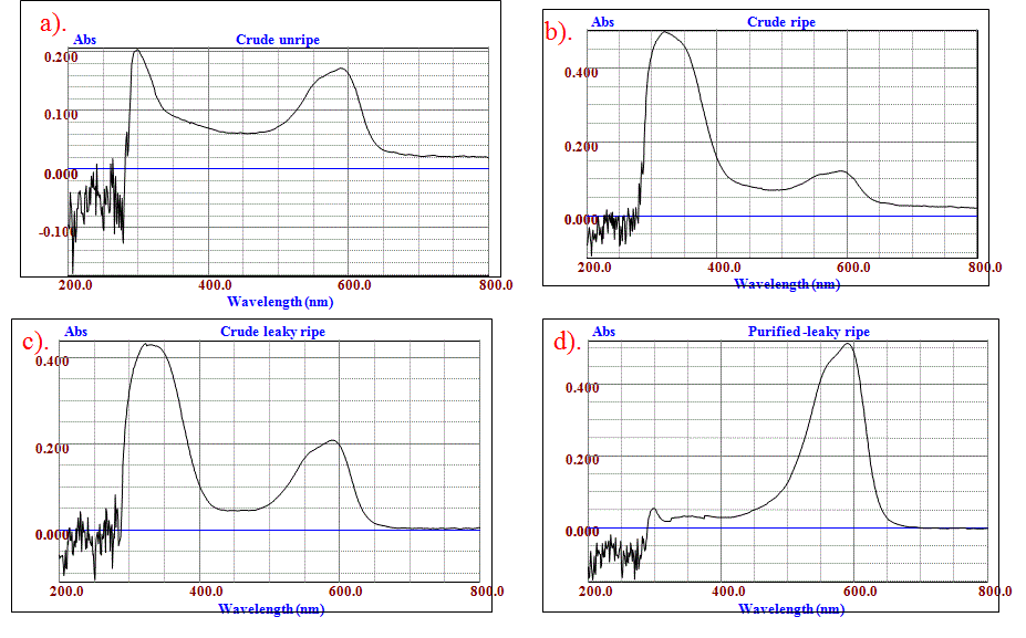 Oxalate oxidase activities by MBTH assay were examined by a spectrophotometer at 590 nm. In fig. 2 a, 2 b and 2 c different peaks were detected in the crude extracts of banana peel, where as a single peak was identified in a purified fraction obtained from the extract of leaky ripe banana peel in the region of 590 nm* as shown in fig. 2 (d). Peak at 590 nm determined the liberation of H2O2 when compared with standard 10-100 mM H2O2. Oxalate oxidase, an H2O2-generating enzyme showed the highest activity in the purified sample of leaky ripe (P-2 leaky ripe) banana peel.