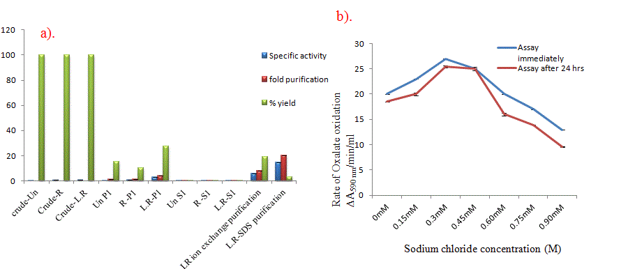 Fig. 3: Determination of (a) Specific activity, Purification factor and % yield of enzyme oxalate oxidase in crude and purified samples of banana peel (b) effect of sodium cholride on to the activity of oxalate oixdase in assays mixture using MBTH assays at A590 nm* in triplicate. Error bars are a repesentation of standard deviation, N=3