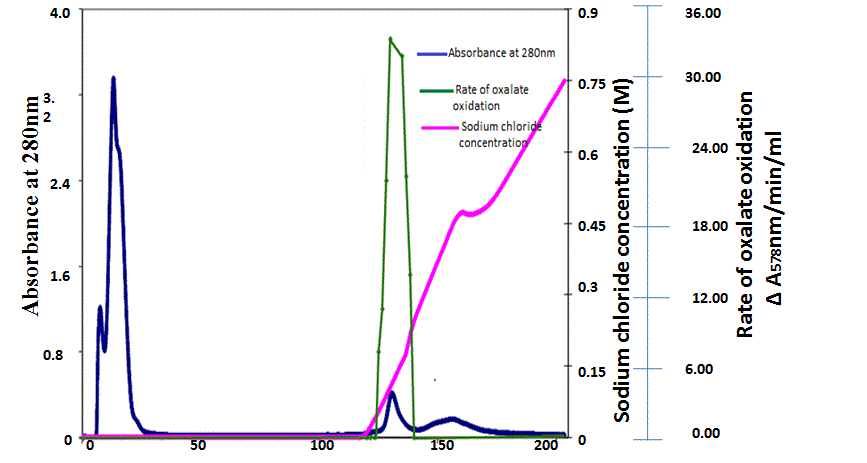The dialyzed enzymes were loaded on to CM Sephadex C-50 (weak cation exchange) column (1.5×100 cm) previously equilibrated with 0.05 M HEPES buffer pH 7.0. The column was eluted in the same buffer at the flow rate of 0.5 ml/min [21, 23]. Fraction was collected and monitored for protein and oxalate oxidase activity. The bound proteins were eluted by a linear gradient of NaCl (0-0.9 mM) in 0.05 M HEPES buffer pH 7.0 and 3 ml were collected from the flow rate of 0.5 ml/min and again tested for protein and oxalate oxidase activity. The active fractions were pooled, and their specific activity was calculated.