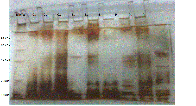 Fig. 5: Protein profiling of crude and 80% ammonium sulfate saturated fractions of unripe, ripe and leaky ripe samples by Sodium dodecyl sulfate polyacrylamide gel electrophoresis using a 12% uniform gel. MMW: Molecular weight marker; Cu: crude unripe protein; CR: Crude ripe protein; CO: Crude leakyripe protein; Su: Unripe supernatant; SR: Ripe supernatant; SO: Leakyripe supernatant; Pu: Precipitated unripe protein; PR: Precipitated ripe protein; PO: Prcipitated leakyripe protein