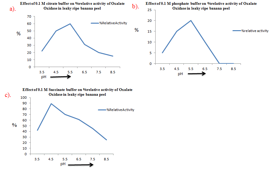 Optimal pH: For the determination of desirable pH of enzyme, 0.1 M Succinate, citrate and phosphate buffer was used with pH ranges 3.5- 8.5 as shown in fig. 7 (a), (b) and (c). In leaky ripe banana peel oxalate oxidase exhibited optimal (89 % Relative activity) activity in a succinate buffer at pH 4.5 whereas, unripe sample exhibit two different peaks.