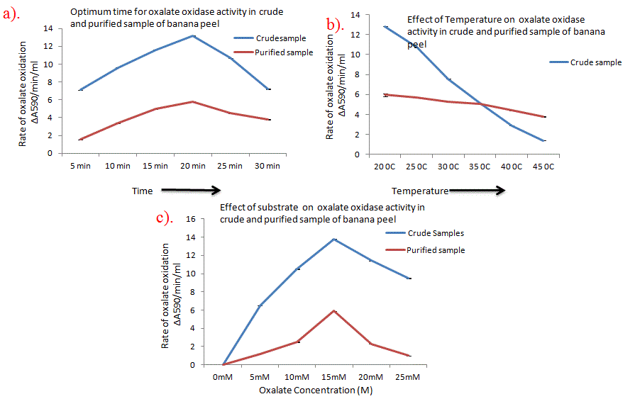 Fig. 8: (a) Determination of oxalate oxidase activity in crude and purified samples of banana peel at different time intervals. (b) Temperature variations and (c) substrate concentrations on the activity of oxalate oxidase in crude and purified samples of banana peels. The data are displayed with mean+standard deviation (bars) of three