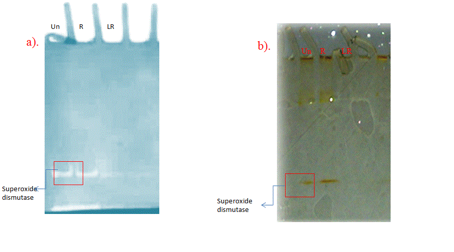 Fig. 9 (a) shows the negative staining of superoxide dismutase. Intense band in 1st and 2nd lane strongly support the activity of superoxide dismutase in an unripe and ripe banana peel sample whereas in fig. 9(b) appearance of brown band in lane 2nd and 3rd vigorously supports the activity of superoxide dismutase positive stain.