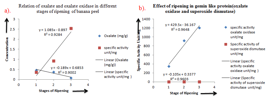 In crude extract of banana peel significant activities of oxalate oxidase were detected within the range of 0.269+ 0.020 to 0.724+0.027unit/mg (unripe to leaky ripe), whereas the activities of superoxide dismutase were recorded 2.41+0.185 to 1.88+0.091 unit/mg. Superoxide dismutase converts superoxide anions into H2O2. One germ in like protein from barley does not possess oxalate oxidase or superoxide dismutas activity. However, in banana peel, both germin like protein were detected. Oxalate oxidase was detected in later stage of ripening whereas the superoxide dismutase shows activity in early stage of ripening. Enzyme and gene expression data suggest that both oxalate oxidase and germ in like protein genes play roles in plant defense responses fig. 10 (a) shows that effect of ripening and their correlation with oxalate and oxalate oxidase activity.