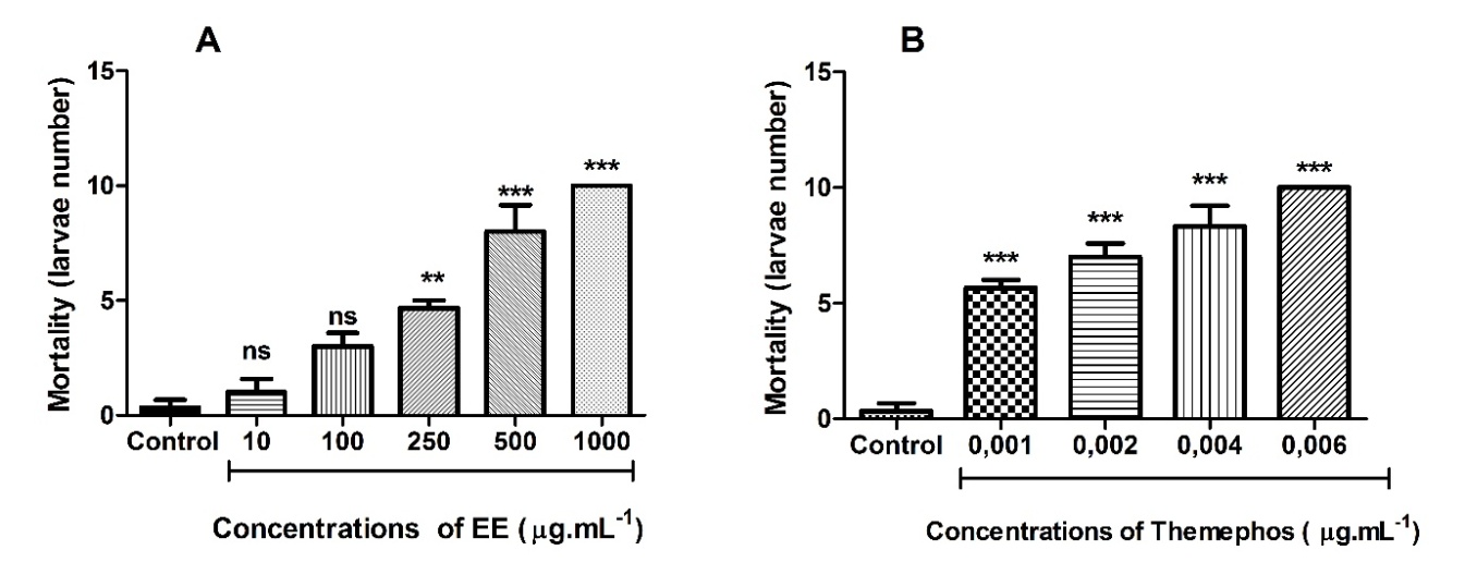Fig. 2: Mortality in number of L3A. aegypti dead larvae. A: Using the S. larvata crude ethanolic extract (EE). B: Using positive control themephos.*p<0.05, **<0.01, ***<0.001 compared with the control group (Tukey test)