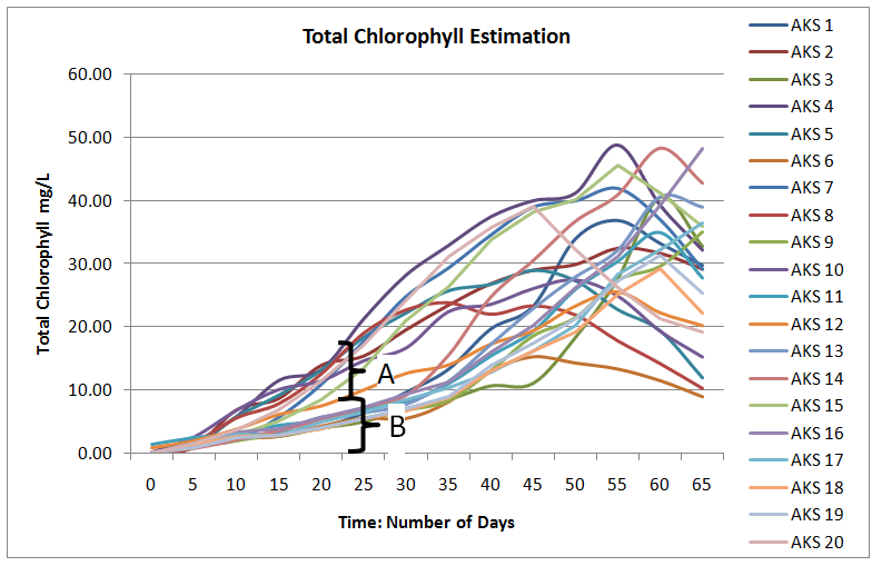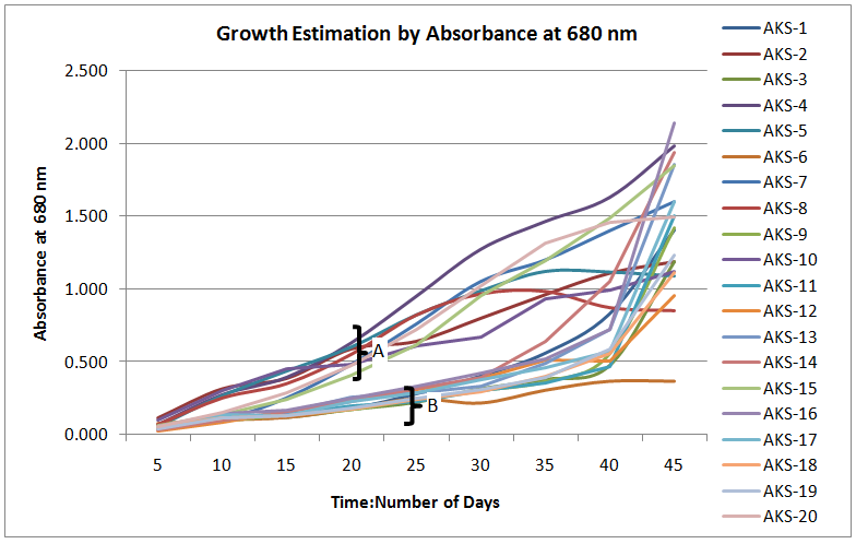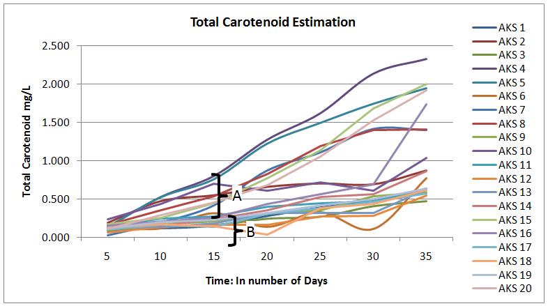 The growth profile of selected species also showed that total chlorophyll and presence of carotenoids reached to their maximum concentration at stationary phase as showed in fig. 7 and8 respectively. The observation of growth, total chlorophyll and total carotenoids by all the isolates showed two clear patterns that has been demarcated as group A (AKS-2, AKS-4, AKS-5, AKS-7, KAS-8, AKS-10, AKS-15 and AKS-20) and Group B (AKS-1, AKS-3, AKS-6, AKS-9, AKS-11, AKS-12, AKS-13, AKS-14, AKS-16, AKS-17, AKS18, and AKS-19). The growth profiling of all the isolates belonging to show that Group A was is a group of fast grower isolates while Group B members were slow growers initially. The latter group showed slow growth till 40th day and then a steep rise in cell biomass, total chlorophyll, and total lipid accumulation, where AKS-4 was found to be the fastest grower while AKS-6 was the slowest grower. This sudden rise in all group B members may be accounted for some complex biochemical mechanisms occurring in them. The results shown here further indicate a fact that the slow growing species provide good results in terms of total lipid produced if cultured for prolonged time, so the total yield per unit over time will be higher than the fast growers.