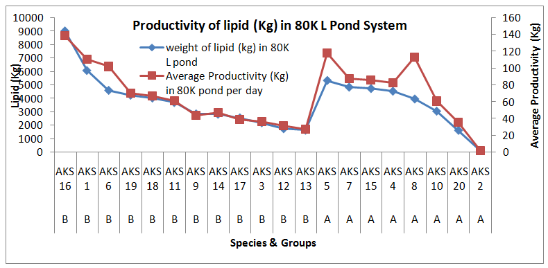 The data obtained in present investigation were extrapolated for an 80,000 L raceway pond system and the productivity per day is shown in table 5 and fig. 10. It has been observed that the organism of choice changes to AKS-16 (a Desmodesmusspecies), from AKS-1/ AKS-8 (the two highest percent lipid producers), or AKS-6 (the highest biomass producer). Although, depending on the nature and priorities of a given program, a higher biomass producer can be of choice because for the economics and potential uses of the high quantities of the leftover biomass after lipid extraction. Moreover, a higher biomass will definitely reduce the cost of nutrient recycling in any of the mass scale algae production program.