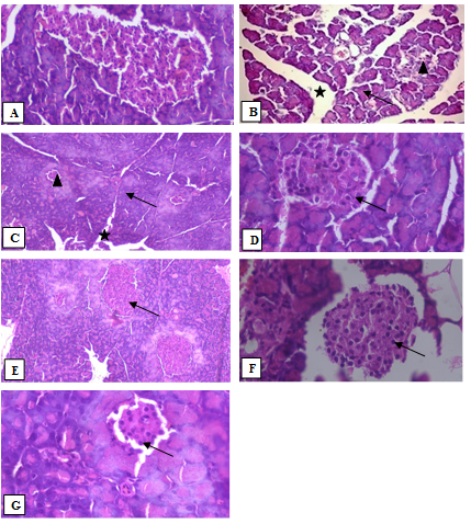Fig. 1: Histopathology of pancreas in alloxan-induced diabetic rats. A. Control group showing the normal architecture of the pancreas. The exocrine constituent systems of pancreas closely packed by acinar cells and arranged into small lobules. Pancreatic lobules detached by intactintra lobular and interlobular connective tissue septa. The islet cells are seen interspersed between the acinar cells. The islets appeared lightly stained than the surrounding acinar cells. B. Diabetic rats revealed pathological changes of both exocrine and endocrine components. Theacinar cells were swollen and small vacuoles were observed in almost all acinar cells. Interlobular ducts were lined with flattened epithelium (indicated by black triangle). Islet β-cells are almost fully lost in alloxanmonohydrate treated rats. C. Diabetic rats treated with Glibenclamide (5 mg/kg) showing distortion of the general architecture. Most exocrine acini revealed acinar damage represented by cytoplasmic vacuolation and cell atrophy (indicated by black triangle). Wider interlobular (marked by black arrow) and intralobular (marked by black star) duct was observed. D. Diabetic rats treated with EEZO (200 mg/kg) displaying nearly normal structure of Islets of Langerhans. Atrophic change of the acinar cells was less severe and the border between exocrine and endocrine portions became more distinct. E. Diabetic rats treated with EEZO (400 mg/kg) shown rejuvenation of islets. The small vacuoles in the basal area of acinar cells were also much smaller. F. Diabetic rats treated with AEZO (200 mg/kg) shown rejuvenation of islets. The small vacuoles in the basal area of acinar cells were also much smaller. G. Diabetic rats treated with AEZO (400 mg/kg) shown displaying the nearly normal structure of Islets of Langerhans. Atrophic change of the acinar cells was comparatively severe and the border between exocrine and endocrine portions became more distinct