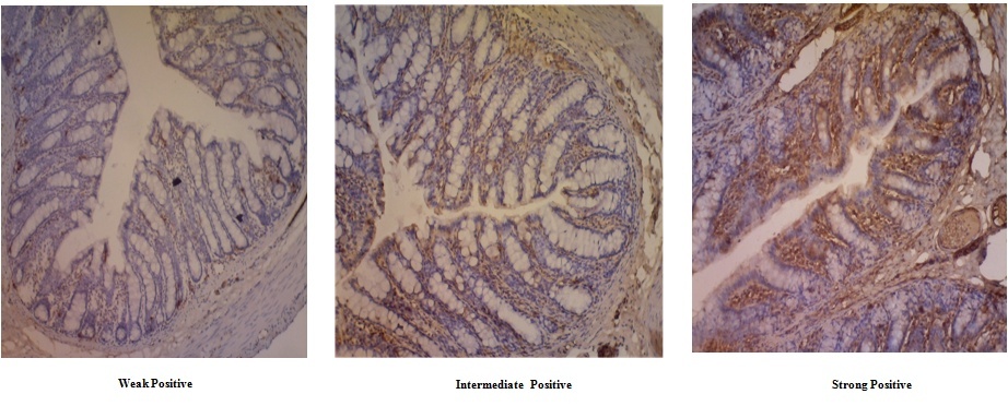 Fig. 1: Microscopic photographs of colon stained with IHC, showing weak, intermediate and strong positive serotonin expression