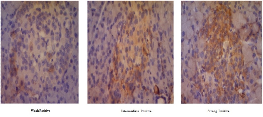 Fig. 2: Microscopic photographs of pancreas stained with IHC, showing weak, intermediate and strong positive serotonin expression