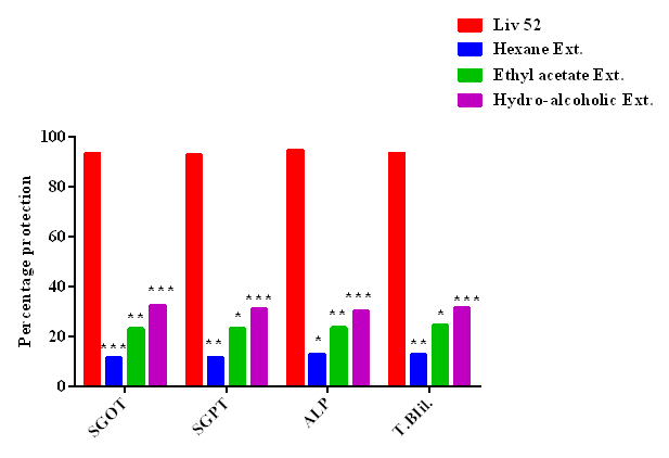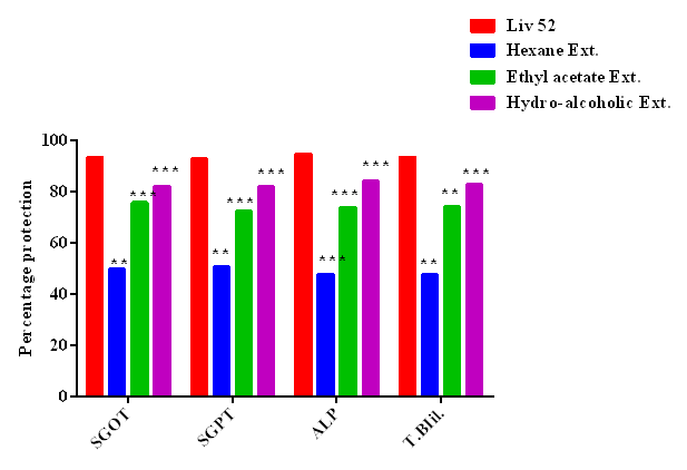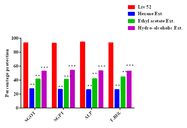 Results: The tested extracts (hexane, ethyl acetate, and hydro-alcoholic) possess biologically active compounds such as sterols, terpenoids, glycosides, phenolics, alkaloids, flavonoids. The hydro-alcoholic extract has more phenolic contents (24.28±0.3) and flavonoid contents (22.68±0.6). The extracts showed dose dependent activity on tested free radicals and extracts showed more percentage inhibition at 320µg. The hydro-alcoholic extract showed more percentage inhibition i.e. 71.00±2.08 on DPPH free radical, 79.67±1.20 on hydroxyl free radical and 80.33±1.20 on superoxide free radical. As antioxidant activity of hexane and ethyl acetate extracts was less and they also showed less percentage protection on liver toxicity, hydro-alcoholic extract showed more percentage protection on biomedical enzyme levels of liver toxicity at high concentration i.e., 400 mg/kg b.w. The percentage protection on the enhancement of AST (SGOT), ALT (SGPT), ALP, and total bilirubin levels were 82.24%, 82.14%, 84.18%, and 82.85% are significant (P<0.01) as Liv52 shown percentage protection on the enhancement of Aspartate aminotransferase (SGOT), alanine aminotransferase (SGPT), Alkaline phosphatase (ALP) and total bilirubin levels were 93.58%, 92.83%, 94.67% and 93.57%.