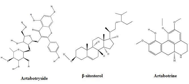 Yu J et al. 2002 have isolated four neo-lignans-isoamericanin A, isoamericanol A, americanin B, and artbotrycinol and a hemiterpenoid: (R)-artabotriol and other compounds from the seeds of A. hexapetalus and reported the presence palmitic acid, β-sitosterol, and daucosterol [30]. Wong H et al. 2002 have reported that the dichloromethane extract of the aerial parts of A. hexapetalus contains β-methoxy-γ-methylene-α, β-unsaturated-γ-butyrolactones which are anticipated to be derived from a C-18 unsaturated fatty acid [31]. Yu J et al. 2001 have studied the chemical constituents of the seeds of A. hexapetalus. Eight compounds were isolated and identified as four Neolignans-isoamericanin A, isoamericanol A, americanin B, and artbotrycinol, a semiterpenoid: (R)-artabotriol and others [32]. Li T et al. 1997 reported the isolation of various constituents from A. hexapetalus leaves. They isolated two new flavonol glycosides derivatives of artabotryside and three known flavonoids: taxifolin, 7-O-glucoluteolin, apigenin glycoside, and two organic acids as succinic and fumaric acid. Based on spectral analysis structures elucidated were quercetin and kaempferol [33]. Tong-Mei Li et al. 1997 reported the isolation of two novel flavonol glycosides from the leaves of A. hexapetalus. Isolated compounds were named as arapetaloside A and B. Additionally taxifolin, apigenin glucoside, and glucoluteolin flavonoids were also isolated [34]. Somanawat J et al. 2012 isolated and identified a megastigmane glucoside along with four flavonoid glycosides from the leaves of A. hexapetalus. They identified these compounds by applying various spectroscopic techniques. Also for the first time occurrence of megastigmane glucoside and quercetin triglycoside in this plant is being reported [35]. Feng-Min Xi et al. 2017 isolated seven pairs of sesquiterpene from the roots of A. hexapetalus identified as a new peroxy-bridge sesquiterpene and peroxy-bridge norsesquiterpene with five known compounds. Their structures of compounds were confirmed by elucidation based on spectroscopic characterization. Seven pairs of stereoisomers were confirmed by chiral HPLC [36]. Qi Zhou et al. 2015 reported the isolation of two new alkaloids as benzylisoquinoline derivatives named hexapetalines A and B from the stems of A. hexapetalus. The structures of hexapetalines were elucidated by using extensive spectroscopic methods and compounds were identified by comparisons with the literature [37]. Yao Xue et al. 1998 have isolated two new flavonol glycosides, artabotryside A and B, three known flavonoids: taxifolin, 7-O-glucoluteolin, apigenin-7-O-apiosyl glycoside, and succinic and fumaric acid from the leaves of A. hexapetalus. The structures of compound artabotryside and its derivative were elucidated based on spectral analysis. For the first time, compound quercetin-3-O-alpha-L-rhamnopyranosyl (1->2)-alpha-L-arabinofuranoside and kaempferol-3-O-alpha-L-rhamnopyranosyl (1->2)-alpha-L-arabinofuranoside were isolated [38]. Singh A et al. 1997 have reported the isolation of the flavonol glycosides–quercetin, quercetin 3-O-glucoside, 3-O-arabinoside, and 3-O-galactoside along with kaempferol, myricetin, and gallic acid from the leaves of A. hexapetalus [39]. Phan, G et al. 2007 reported extraction, identification, and analysis of essential oil from the flower of A. hexapetalus. Compounds were analyzed by using GC and GC/MS spectroscopic techniques. Twenty-six components of the oil that were identified as sesquiterpene hydrocarbons and oxygenated sesquiterpenoids, β-caryophyllene, and caryophyllene oxide [40]. Mahidol C et al. 2005. Investigated compositions of the essential oils from flowers of A. hexapetalus. the flowers were subjected to hydrodistillation, solvent extraction, solid-phase microextraction, and simple headspace solvent-trapping technique. By hydrodistillation, thirty-one components and five unidentified ones were identified together as β-caryophyllene, β-gurjunene, and globulol. Employing solvent extraction method thirty-one components were identified as 3-methyl butanol, 2-methylbutanol, ethyl butanoate, isopentyl acetate, 2-methyl butyl acetate, limonene, linalool, and two unidentified components. The other two unconventional extraction methods were employed as simple headspace solvent-trapping techniques. Using this method, seventeen components were identified as ethyl acetate, ethyl isobutanoate, isobutyl acetate, and ethyl butanoate. Employing the Solid-phase microextraction technique the headspace vapor of the fresh flowers was absorbed on the viscous liquid, polydimethylsiloxane (PDMS), and injected directly into the GC-MS. By using this method Thirtynine components were identified with three unidentified ones were Ethyl acetate, ethyl isobutanoate, isobutyl acetate, ethyl 2-methyl butanoate, ethyl isovalerate, ethyl 3-methyl-2-butenoate, isobutyl isovalerate, and β-caryophyllene [41].