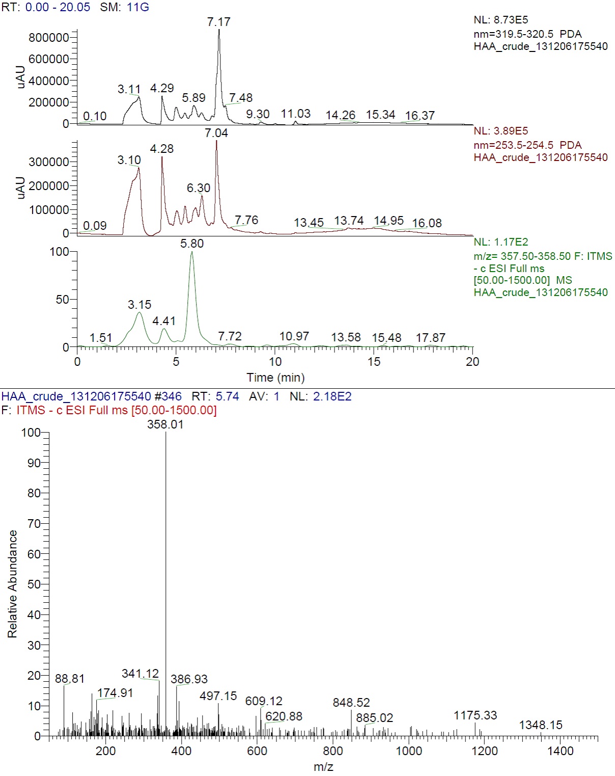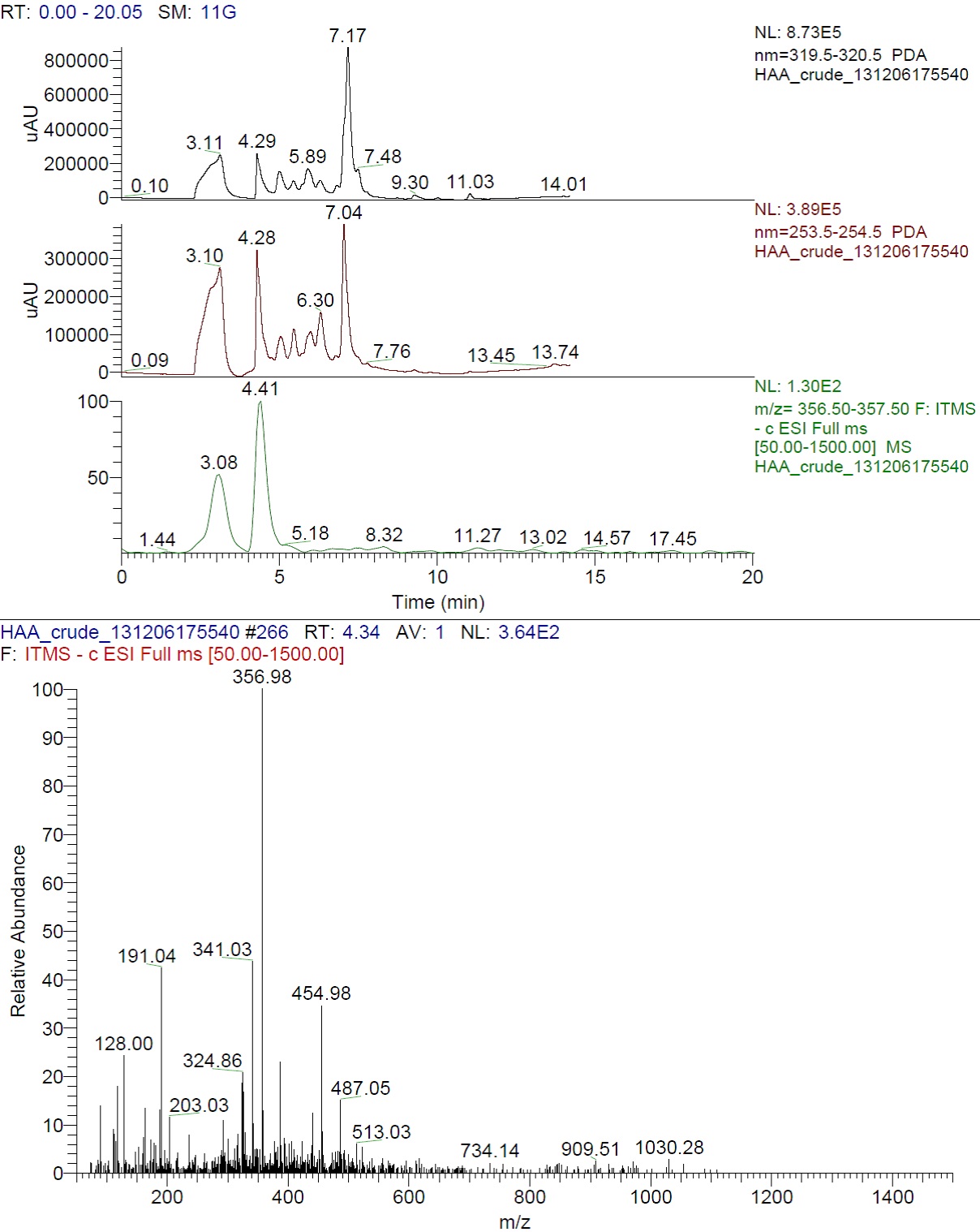 HPLC conditions for HALH The column used was C18, 3 µm, 100 x 4.6 mm. The volume of injection was 5 µL and the flow rate was 350 µl/min. The solvent system used was 0.1% formic acid (Solvent – A) and acetonitrile 100% (Solvent – B). The experiment was performed in gradient mode and the elution was done for twenty minutes. The column was maintained at ambient temperature [7].
