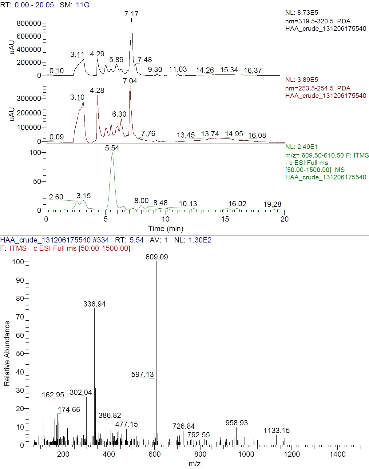 In the LCMS analysis [9] of defatted HALH, presence of ten different mass values was observed and is tabulated in table 3. Out of the above ten different mass values, the molecule depicting the mass value 609 was identified as rutin with the UV lambda max. determination, PC, HPLC and LC MS/MS studies. The IR and NMR spectrum also reconfirmed the above findings.