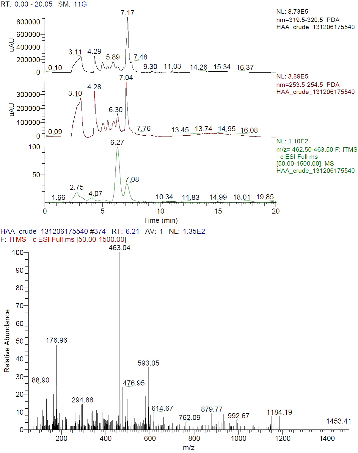 In this study, the retention time of the component marked HA-1(6.11 min.), HA-2 (8.58 min.) and HA-3(8.77 min.) matched well with the retention time of rutin, apigenin and kaempferol standards obtained from Sigma. In the MS/MS studies, the quantity of each component present was estimated by comparing with AUC of the respective component. The presence of quercetin was confirmed earlier by HPLC method.