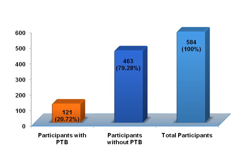 A total of 584 PLWHAs were included in the study from January 2018 to December 2019. We found 121 (20.72%) among 584 people living with HIV/AIDS were confirmed with Pulmonary Tuberculosis, are shown in fig. 1.