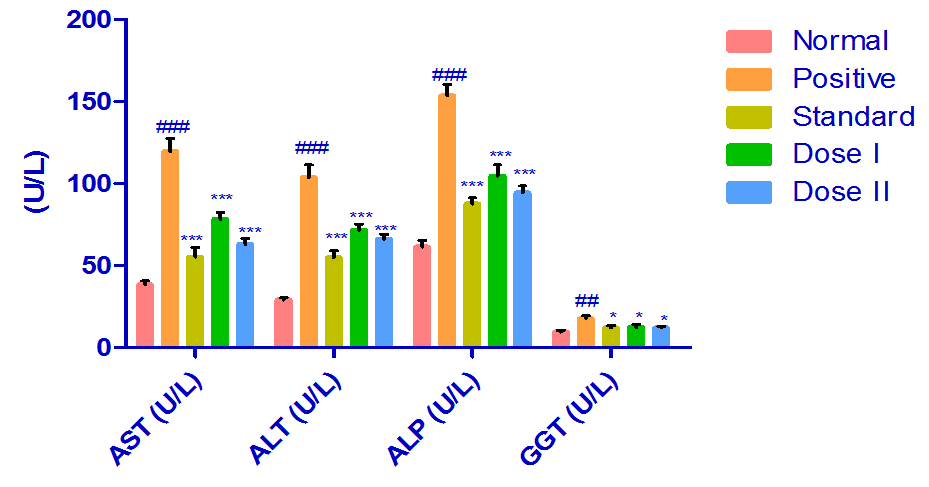 Fig. 1: Effect of MC+PA on serum AST, ALT, ALP and GGT levels in Anti-tubercular drugs-induced hepatotoxicity model, values are expressed as mean±SEM, n=6. #p<0.05, ##p<0.01, ###p<0.001 when compared to normal.*p<0.05, **p<0.01, ***p<0.001 when compared to positive control