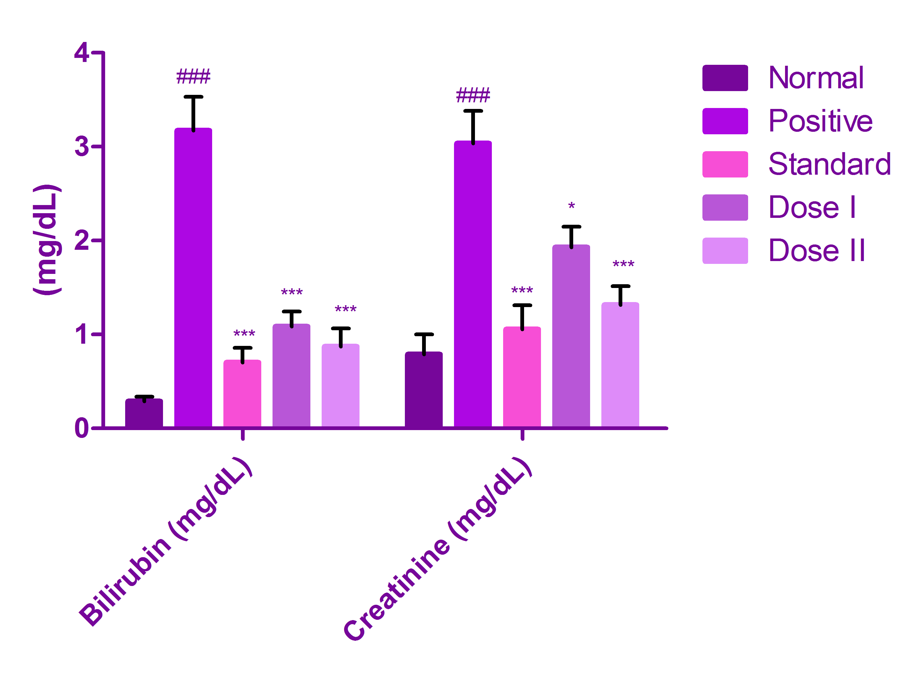 Fig. 2: Effect of MC+PA on serum bilirubin and creatinine levels in Anti-tubercular drugs-induced hepatotoxicity model, values are expressed as mean±SEM, n=6. #p<0.05, ##p<0.01, ###p<0.001 when compared to normal.*p<0.05, **p<0.01, ***p<0.001 when compared to positive control