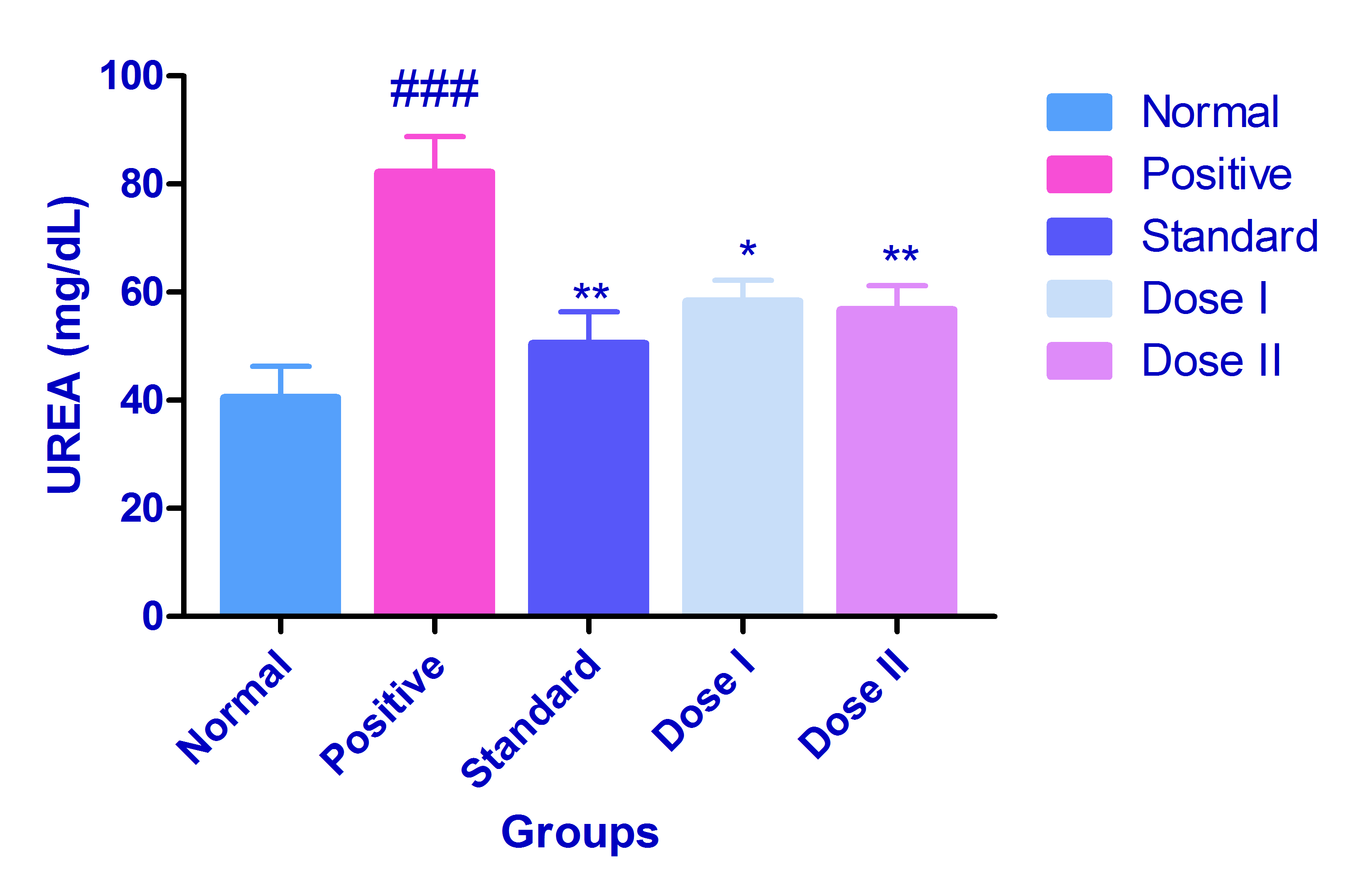 | 6 | Urea (mg/dl) | 40.41±5.89 | 68.33±4.06### | 50.83±2.10* | 53.33±1.78* | 51.66±6.11* |
