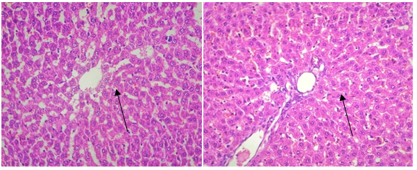 The results of the ethanol-induced hepatotoxicity model are shown in table 1 and 2. Whereas, the results of anti-tubercular drugs-induced (INH+RIF) hepatotoxicity model are represented in table 2 and fig. 1, 2 and 3. Oral administration of hepatotoxic agents like ethanol and INH+RIF showed a remarkable rise in the serum levels of AST, ALT, ALP, GGT, Urea and creatinine (biochemical markers). Whereas pretreatment with Silymarin (100 mg/kg) and MC+PA at various doses of 200 and 400 mg/kg significantly decreased the elevated profile of the serum biochemical markers when compared to positive groups of two models. Anti-oxidant status was measured using liver homogenate in both the models, and there was a significant reduction in SOD activity caused by ethanol and INH+RIF administration when compared with normal, which was enhanced by treating with the combined extract (MC+PA) at both doses and also by silymarin. Further, the hepatic MDA was also elevated significantly in the positive groups of two models. Pre-treatment with MC+PA (200 and 400 mg/kg) and silymarin reduced the elevated concentrations of MDA in comparison with positive groups of two models (table 2). The histopathological results of positive groups of two models revealed mild degenerative changes of perivenular hepatocytes, distorted architecture, centrilobular necrosis and mild inflammatory cell infiltration. Pre-treatment with silymarin and MC+PA of various doses improved the damaged conditions caused due to ethanol and INH+RIF administration (fig. 4 and 5).
