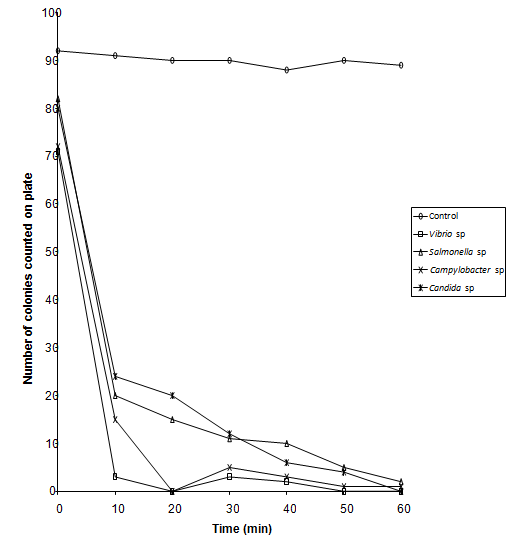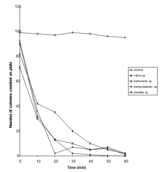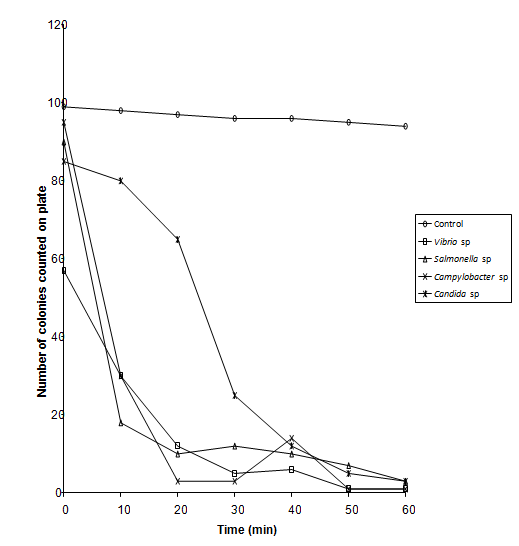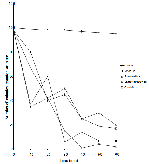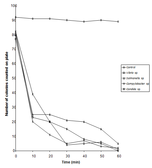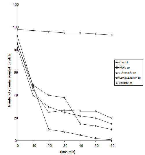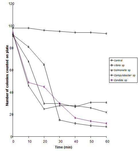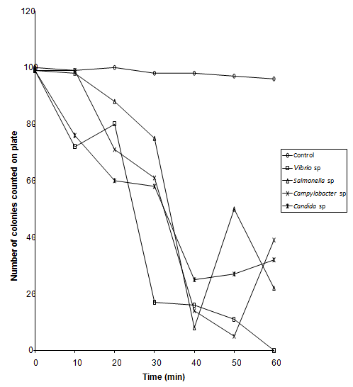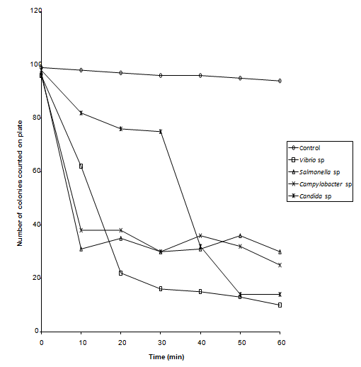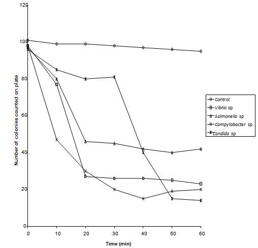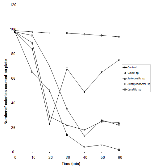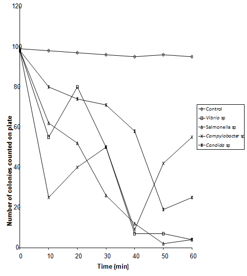 Organisms used in this experiment were Campylobacter sp., Salmonella sp., Vibrio sp. and Candida albicans. Bacteria were grown in Nutrient Agar Broth oxoid and yeast was grown in SD broth for 24 hrs at 37oC, Nutrient broth at 42oC for Campylobacter species. Cultures were centrifuged at 512g (sigma model 3k- 1) for 10 minutes and resulting cell pellets re -suspended in 0.1% peptone.