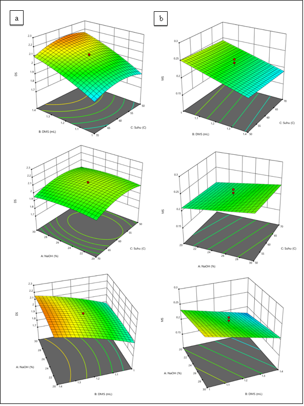 Response surface methodology is a statistical approach used to evaluate the influence of the three factors (concentration of sodium hydroxide, amount of dimethyl sulfate and reaction temperature) on response variables, degree of substitution (DS), and molar substitution (MS). The amount of dimethyl sulfate used has a greater effect on DS value than the other factors. The greater amount of dimethyl sulfate used, the higher value of the DS obtained. This is probably due to a large number of methoxy groups in the reaction environment that can increase the possibility to form a bond. On the other hand, excessively used dimethyl sulfate can reduce the MS value. This is probably due to the competition between the methoxy group of dimethyl sulfate with hydroxypropoxy groups of propylene oxide to form a bond on the anhydroglucose unit of cellulose. The methoxy group has a high reactivity on the C2, C3, and C6 atoms of anhydroglucose units, whereas the hydroxypropoxy group tends reactive to the C6 atoms of anhydroglucose units [9]. The concentration of sodium hydroxide used has a more significant effect on DS and MS values than reaction temperature. Sodium hydroxide has an important role to increase the reactivity of anhydroglucose units which is related to the swelling ability of cellulose. In this condition, a bond will be formed on-OH group becoming Na-cellulose. Na-cellulose will be reacted with dimethyl sulfate and propylene oxide, Na+will be substituted to form methoxy and hydroxypropoxy groups [25]. Although the impact is not significant, high reaction temperatures can reduce the value of DS and MS. This is probably due to the role of temperature in helping the diffusion of sodium hydroxide into cellulose. Insignificant temperature differences will not affect this mechanism [26].