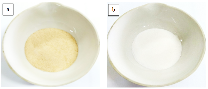 Fig. 2: HPMC BB powder (a) and HPMC 60SH powder (b)
