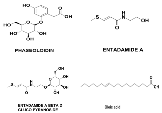 Subjecting of MEEP to fractionation and purification led to the isolation of 4 compounds. The structures of isolated compounds were known by using IR, MS, 1D, and 2D NMR spectroscopic techniques. A comparison of the spectral data with those reported in the literature [30] led to identification and confirmation of the compounds as Oleic acid (1), Entadamide A (2), Entadamide A-b-D-glucopyranoside (3) and Phaseoloidin.
