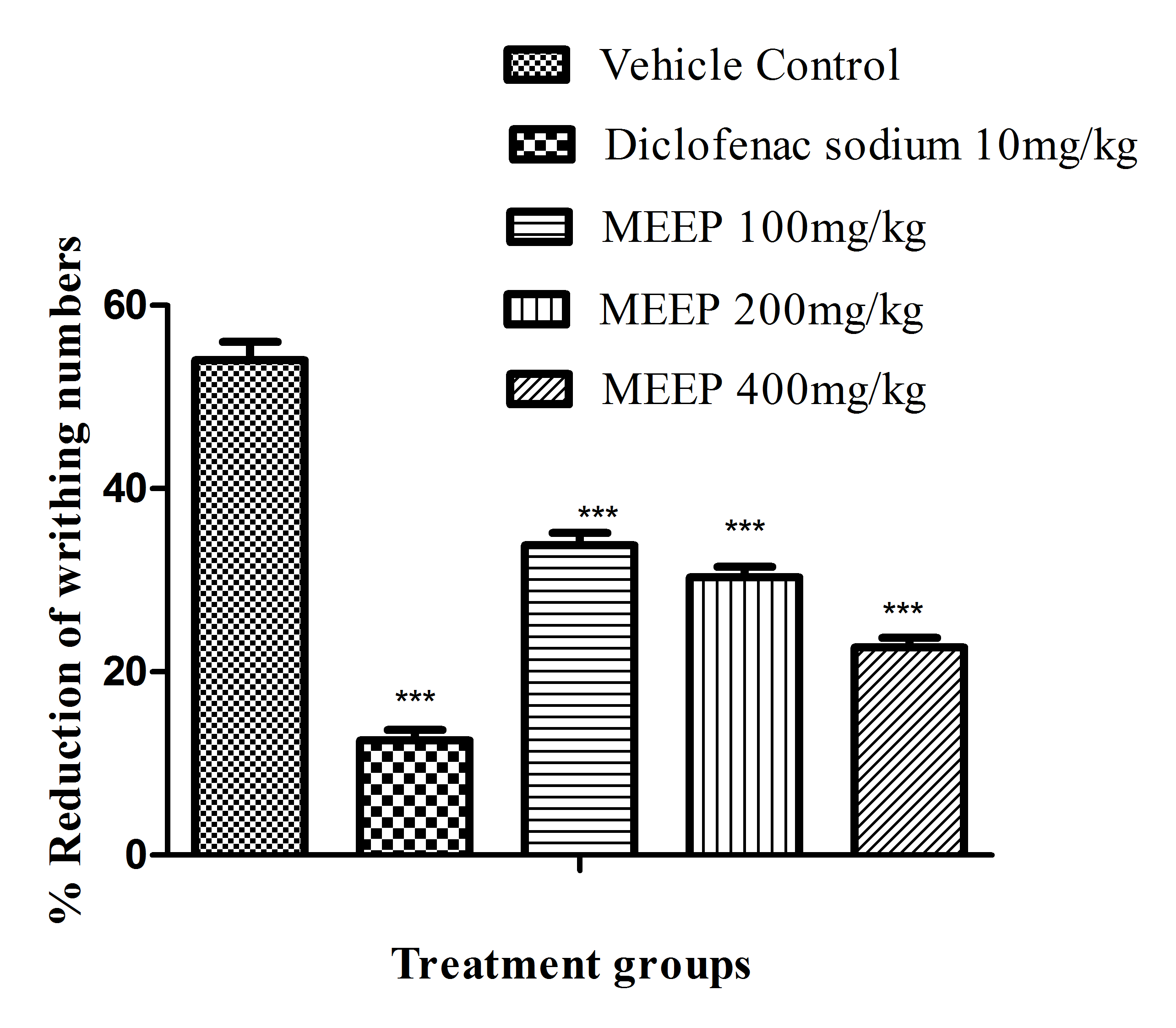 Fig. 2: Analgesic effects of the MEEP and diclofenac sodium on the acetic-acid-induced writhing response in mice. Each value represents as mean ± SEM. ***p < 0 .001 as compared with the control group (one-way ANOVA followed by "Dunnett's Multiple Comparison Test"