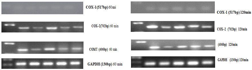 Effects of MEEP on gene expressions of COX-1, COX-2, COMT, IL-6 and TNF-α at 60 and 120 min time intervals respectively by Reverse transcriptase PCR (RT-PCR)