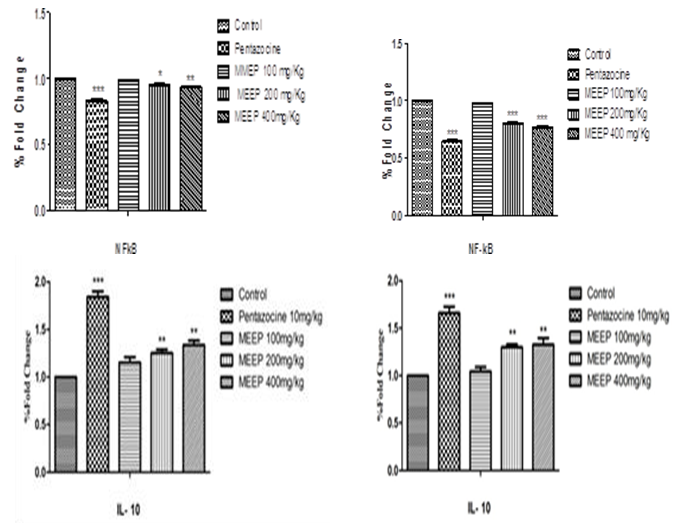 Protein expressions in the serum of control as well as test groups, were assayed by western blotting. The results of the test groups as well as a standard drug (pentazocine) were compared with the control group. The results elucidated that there was down-regulation of NFκB and up-regulation of protein levels of IL-10 in the MEEP treated groups when compared with the control group. Dose and time-dependent significant down-regulation were observed in the protein levels of NFκB at 60 and 120 min (p<0.001) following extract administration. At 120 min time interval, there was significant down-regulation of the targeted NFκB gene, while protein expressions of IL-10 were significantly up-regulated in 400 mg/kg body weight treated rats when compared to the control (fig. 4).