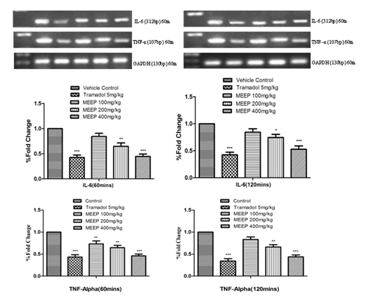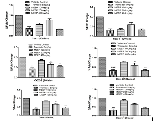 The Reverse Transcriptase-PCR analysis of gene expression on COMT, COX-1, COX-2, IL-6, and TNF-α at 60 and 120 min time intervals is presented in fig. 3. The mRNA expression levels of COMT at 60 and 120 (p<0.001) min were significantly up-regulated in the MEEP treated rats as compared to the vehicle control group. COX-1 enzyme demonstrated no significant difference between the groups. However, mRNA expression levels of COX-2 at 60 and 120 (p<0.001) min were significantly down-regulated in the MEEP treated rats as compared to the vehicle control group. The mRNA expression levels of IL-6 at 60 and 120 (p<0.001) min were down-regulated in the MEEP treated rats as compared to the vehicle control group; the down-regulation of mRNA expression levels of TNF-α at 60 and 120 (p<0.001) min could also be seen in the MEEP treated rats compared to the vehicle control group. The mRNA expression levels of IL-6 at 60 and 120 (p<0.001) min and TNF-α at 60 and 120 (p<0.001) min were almost similar in the tramadol treated rats compared to the vehicle control group.