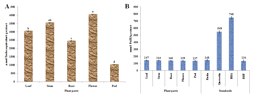 Fig. 1: Total antioxidant capacity (a) and ferric-reducing/antioxidant power assay (FRAP) (b) of the aqueous methanolic extracts of C. obtusa plant parts*.