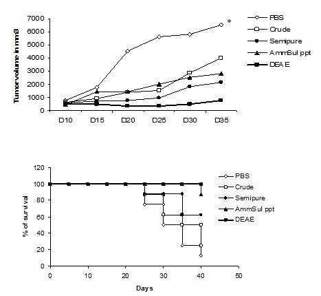 In an attempt to purify the protein present in neem leaf, NLP was extensively dialyzed against PBS (pH 7.4), dialyzed fraction was filtered through membrane with molecular weight cut off upto 10 Kda, precipitated with 35% ammonium sulphate and chromatographed through DEAE-cellulose ion exchange column. Maximally purified active component was appeared as an unbound fraction eluted with 0.15 M NaCl from DEAE column. As DEAE is an anion exchanger, the desired protein is cationic in nature. In each step of purification, yield of protein was monitored by its estimation using Folin’s Phenol reagent. The concentration of purified neem protein was increased in each step after eliminating contaminating materials. The fractions obtained in each step of purification were tested for its tumor growth restricting ability. It was observed that each fraction preserves the tumor growth restricting ability, as guided by tumor protection assay (Fig. 1).