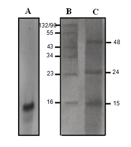 Fig. 2: Analysis of dialyzed NLP by PAGE. 20 µg of NLP was analyzed by 12% nondenatured (A) and 20% denatured (C) PAGE. Molecular weight markers were electrophorsed on 20% denatured PAGE (B). Gel was stained with silver nitrate method