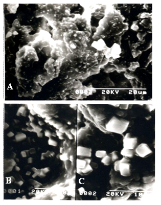 Fig. 3: Scanning electron microscopy of NLGP. Structure of NLGP in different magnifications are presented in A, B, C, as indicated on the photographs