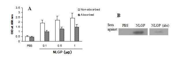 Fig. 4: Immune reactivity of anti-NLGP sera with NLGP. Mice were immunized with either NLGP or PBS once weekly for four weeks. Immune sera were absorbed with NLGP and absorbed/non-absorbed sera were reacted with NLGP coated on plates by ELISA (A) or electrophorsed on PAGE by immunoblotting (B)