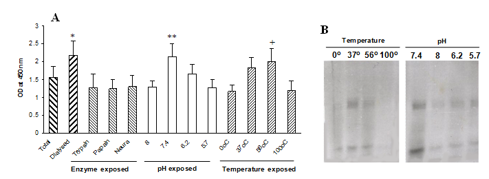 Fig. 5: Recognition of anti-NLGP sera to NLGP after differential exposure to enzymes, temperatures and pHs. NLGP was exposed to different enzymes (trypsin, papain and neuraminidase), temperatures (100oC, 56oC, 37oC and 0oC) and pHs (pH 8.0, pH 7.4, pH 6.2 and pH 5.7). A. Differentially treated NLGPs were coated on microtitre plates. Anti-NLGP sera (generated by immunization of Swiss mice with NLGP) were tested for its immune reactivity with NLGPs by ELISA. *p<0.01, in comparison to the immune reaction with NLGP, treated with trypsin, papain, neuraminidase; **p<0.01, in comparison to the immune reaction with NLGP exposed to pH 8 and pH 5.7; +p<0.001, in comparison to the immune reaction with NLGP, exposed to 0oC and 100oC. B. Differentially treated NLGPs were electrophorsed on 20% SDS-PAGE and stained with silver nitrate